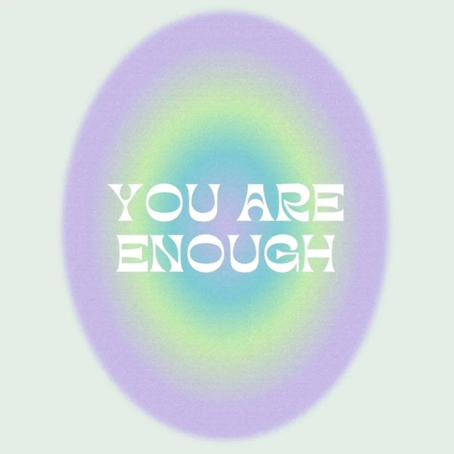 ID: A light green slide background with a light purple thumbprint sized circle in the middle with rings of green, blue, and purple in the center. The text “You are enough” in big block white letters is center of the circle.